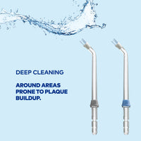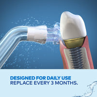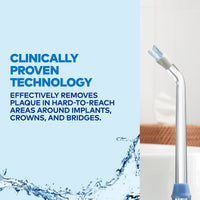 - Attach to flosser handle, aim at gumline or restoration areas, and move in small circular motions for 10 seconds per tooth.